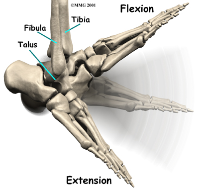 The skeleton of the foot begins with the talus, or ankle bone, that forms part of the ankle joint. The two bones of the lower leg, the large tibia and the smaller fibula, come together at the ankle joint to form a very stable structure known as a