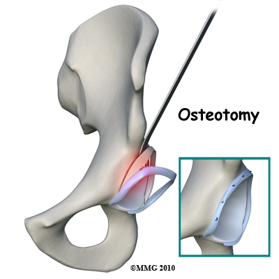 Once it has been decided that surgery is the way to go, the surgeon has three choices: 1) full open incision and correction of the problem, 2) arthroscopic surgery, and 3) osteotomy (cutting the bone to reshape the socket.)