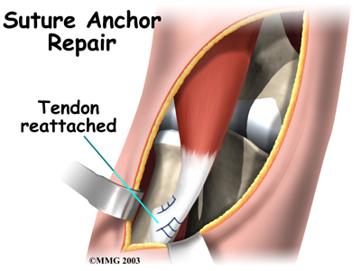 A new method of anchoring the torn tendon to the radius is gaining popularity. This method uses special anchors, called suture anchors, to fix the tendon in place. The procedure requires only one incision and appears to lessen the risk of myositis ossificans. Myositis ossificans is an abnormal healing response that causes bone to form in the muscles and soft tissues.